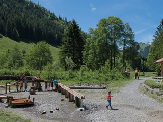 The Gwunderwasser water playground in Tiermatti, Schwenden offers children exciting experiences. There is a play area for splashing around and an experimental area with water play equipment where children can explore natural water dynamics. Would you like to take a closer look at the water? If so, hire a water studies rucksack at the tourist office in Diemtigtal Nature Park for CHF 20.00. There are also guided discovery packages for school classes, which are accompanied by an experienced expert. A nature study hut with teaching resources is also available. Relax on comfortable wooden loungers or take a break at a table with a bench or the open-air barbecue.