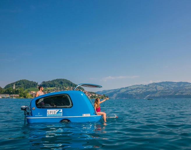is the place to hire and try out a variety of water sports equipment. Take to the deep-blue waters of Lake Thun under your own steam or hire a motorboat that can be skippered without a licence and spend a couple of hours in the middle of the lake. Paddle your canoe over the glistening water or pedal your pedalo along the shoreline. Alternatively, why not chill out with your friends in the Sealander, the floating caravan trailer, enjoying a delicious cheese fondue or barbecued sausages? Would you rather relax in the warmth of the sun for a few hours? The beautifully maintained sunbathing lawn on the shore of the lake is the place to relax and unwind. Snacks and drinks are available in the tourism office’s little kiosk.
