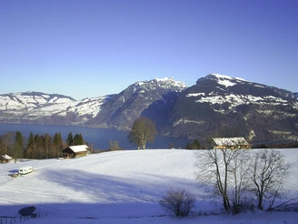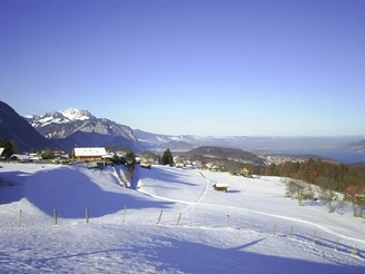 From the PostBus terminus Aeschiried Schulhaus, the route leads northeast past the ski lift parking lot to Windegg, where it turns sharply left and runs parallel to the winter hiking trail for a bit. As it continues downhill across the open terrain, a wonderful view of Lake Thun opens up. Under the training ski lift, the route ascends slightly to the right and continues in a large left curve down to above Ebenengässli. It then goes west to the first houses of the Tannenmattli neighborhood. Turning left, the route runs parallel to the winter hiking trail towards Aeschiried. Below the Chemihütte restaurant, you ascend between two houses onto the fairly flat and open field. Passing a chapel on the left, you ascend gently to the Aeschiried schoolhouse and then back to the starting point.