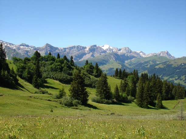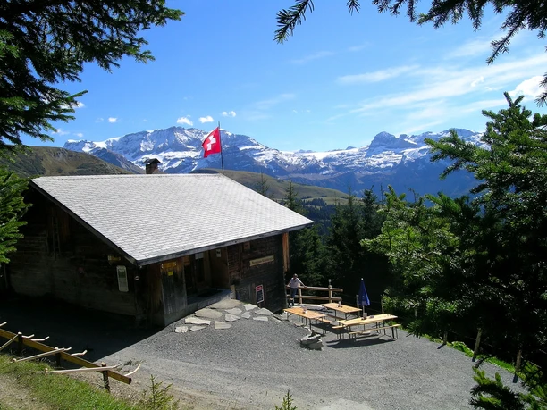 The bus runs from Lenk station up to Bühlberg. From there, the high-altitude hike leads along the west flank of the Lavey ridge, past the reforestation area between Lavey and Obere Seewele, towards Schatthore. In the morning, it is still shady on the west flank of the Lavey ridge. The higher the sun rises, the more its warmth can be felt on your back. If the Obere Seewele alp is operated, a tasty piece of alpine cheese can be bought. Over a ridge you reach the summit of Schatthore, which actually resembles more a long mountain ridge than a 'Hore'. Nevertheless, the view over the Lenk and its side valleys is wonderful. Paragliders can often be seen here, circling high above the heads of the hikers. For the descent, a portion of the path already covered must be retraced to the fork in the path. In a forest clearing lies, like on a arbor, hence the name Laubbärgli, a mountain hut. The charming little wooden house with its red-white checkered tablecloths invites you for a snack. The return to the Lenk is by a small bus directly from Laubbärgli.