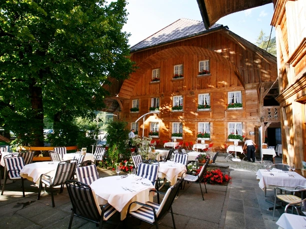 Now across alpine pastures, leaving the huts of Ober Läger on the left, onto the driveable road that leads down to Alp Ällgäuli. Through forest and over a marshy slope hollow, you reach Mirrenegg, from where an alpine lane leads down to the young Emme. At Hinter Hübeli, the lane crosses to the left side of the Emme. The young river rages here like a torrent. The debris cones of the tributary streams hint at how dangerous the water swells after thunderstorms. Pleasant, by contrast, is the cozy comfort radiated by the hospitable Kemmeribodenbad with its mighty roofs.