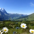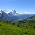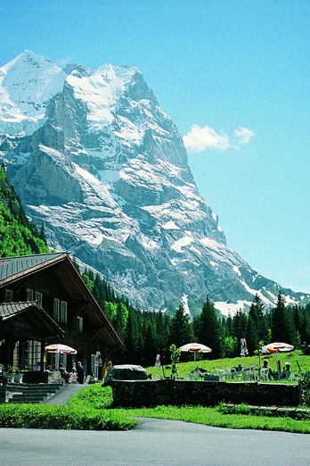Kaum anderswo ist der Übergang aus bewaldeten Tälern über weite Alpweiden zu Fels, Eis und Schnee so bildhaft zu erleben. Jäh ragt die fast senkrecht abfallende Wand des Wetterhorns auf. Frei ist die Sicht über Grindelwald hinweg zur Kleinen Scheidegg, neben der sich die berühmt-berüchtigte Nordwand des Eigers erhebt. Für den Abstieg ins Gletscherdorf wählt man den alten, gut erhaltenen Saumweg, der die moderne Passstrasse mehrmals berührt. Im Undren Loichbiel schwenkt man hangwärts auf den Zugangsweg zum oberen Grindelwaldgletscher ein. Rund 600 m Abstieg sind von der Lamm bis zum dichtbesiedelten Talboden von Grindelwald noch zu bewältigen. Die Vogelschau ist perfekt. Leider aber ist von den das Dorf prägenden Gletschern nichts zu sehen. Beim grossen Gletschervorstoss um 1760 hatten sich die Eisströme so tief ins Tal gewälzt, dass deren Zungen bis in den Wald vordrangen. Die darauf folgende Berg-Euphorie führte schliesslich zur Erschliessung der Naturwunder durch Bergbahnen. Doch blieben nicht alle erfolgreich. Beim Hotel Wetterhorn steht noch eine Kabine des ehemaligen Wetterhorn-Aufzuges von 1908, der ersten Seilschwebebahn der Welt. Wegen Kapitalmangel und Beschädigung durch einen Felssturz wurde dem Unternehmen bereits 1934 ein frühes Ende gesetzt. Über Underhüseren erreicht man das lange Strassendorf Grindelwald.