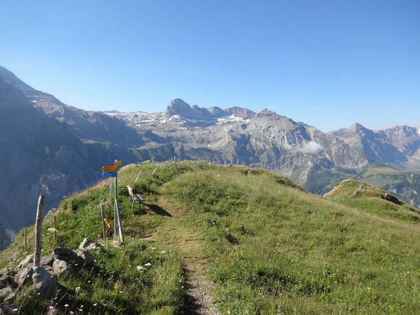 From the Bühlberg bus stop, the hike gently leads via an alpine path up to the Hahnenmoospass. Here, the view opens towards the Entschligetal valley in the direction of Adelboden. The Hahnenmoospass is known as the mecca for model glider pilots. The restaurant on the pass operates a dedicated construction hut for this purpose. From Hahnenmoospass, follow the signpost indication Metschstand. Shortly, you reach the reservoir lake, which in winter is used for snowmaking on the pistes. In summer, the lake is planned to enrich the hiking area as an adventure spot (bathing prohibited!).
