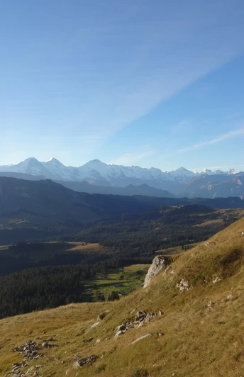 Magnificent view over the Emme's source area to the high Alps. The path leads through loose mountain forest and barren alpine pastures to a large scree field located in the basin between Steinige Matte and the main summit of the Hohgant (point 1897). However, the climb to Furggengütsch takes about another hour. The effort is rewarded with a magnificent panoramic view stretching from Säntis to the Vaud Alps. Equally impressive is the view northwards over the Emmental to the foothills of the Swiss Plateau and the Jura.