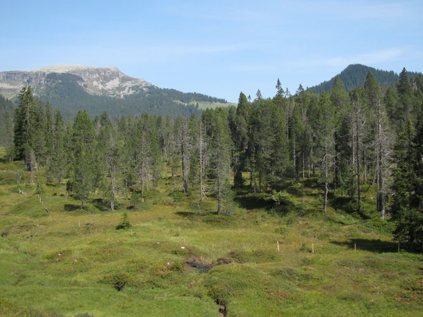 From the Post Habkern, the path goes up into the hillside street, which leads high above the Lammbach valleywards. Shortly after the sawmill, the hard surface ends. The path pulls up steadily to Trogenmoos. Here begins the extensive Seefeld–Hohgant nature reserve, whose wealth of flowers is unparalleled.