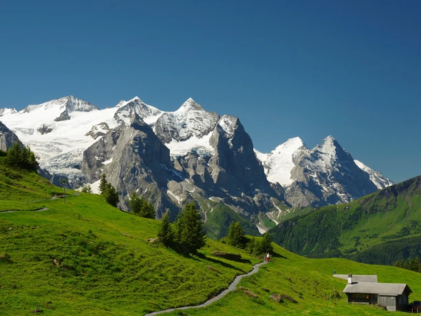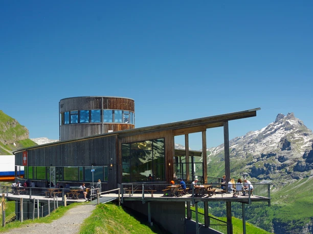 The cable car from Wasserwendi Twing conveniently takes us to the starting point Käserstatt at 1827 m. Impressive is the view to the Wetterhorn, Wellhorn and the jagged Engelhörner, popular with climbers. From here you follow the path called Sonnenweg by Hasliberg Tourism always towards Planplatten. You are accompanied, especially during the alpine spring, by a rich alpine flora, many butterflies and bumblebees. With some attention and luck you may also encounter marmots. The cattle on the alpine pastures seem to enjoy the lush grass. On the right side you always have the dominant Wetterhorn in view. From the Alp Hääggen with self-service snack bar the path becomes steeper, really steep is only the short final ascent to Planplatten. At the highest point is the cable car station with the original Alpentower with a restaurant. Once at the top, the view opens to the Susten area and the Hasli valley, a magnificent panoramic view. Immediately after the Alpentower there are two viewing points with panorama boards that inform us about the exciting mountain world. At the second viewpoint there is a take-off point for paragliders. The beautiful spot invites prolonged stays. A part of the long descent runs on the new ViaBerna, Route 38. The upper part of the path leads through very beautiful alpine landscape, is steep and somewhat rocky. From Gummen it mostly runs on a good forest road. In the lower part you walk a section of the exciting Muggestutz children's adventure path with many places to rest.