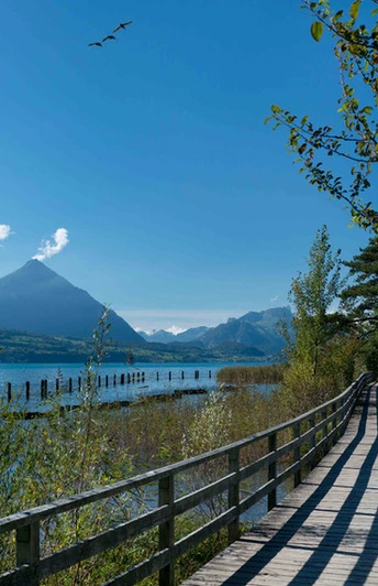 At the foot of a rock band, the pilgrimage path continues to Sundlauenen, which belongs to the municipality of Beatenberg. Initially heading towards Ländte, but halfway turning to the forest edge and crossing the delta piled up from the Sundgraben (a popular recreational area). Follow the street only briefly before a quiet forest path leads past the former Beatus bath, today Manorfarm, to Neuhaus. From here, continue through the Neuhaus-Weissenau nature reserve protected since 1943. This narrow raised bog area is a preferred habitat and breeding ground for many water bird species. At the end of the renatured promenade stand the ruins of the former water castle Weissenau. Along the Aare riverbank, you reach the nearby Interlaken West station via Unterseen.