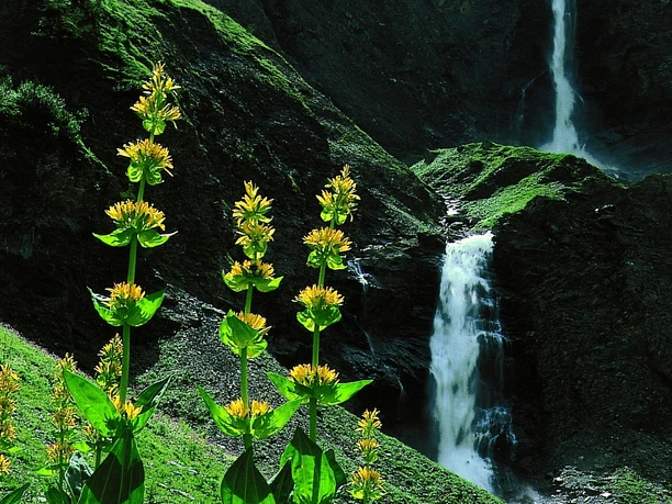 From the village center of Lauenen along the main road downstream to the Rohrbrügg group of houses. Directly after crossing the bridge, turn left and follow the Lauibach and pass through the Rohr nature reserve. After the wetland, you walk through a tranquil forest. Here, forest rangers have carved native animals from tree stumps along the path with chainsaws. They blend harmoniously into nature and distract from the short steep ascent. After overcoming this, the Lauenensee lies in a terrain hollow directly ahead, surrounded by moor meadows. Coots, mallards, and herons breed in this mountain lake, which is threatened by silting up and divided into two parts by a reed belt. In summer, there is often lively (and noisy) bathing activity here. At Büel (5 min to the bus station) the path enters the deeply cut upper valley section of the Geltenbach. Through a narrow gorge limited by the Mutt- and Follhore, one reaches, climbing steeply, the alpine pasture of the Undere Feisseberg. Now the view of the Geltenschuss opens. When looking at this series of cascades and whirlpools, one is doubly grateful for the past efforts of the people from Lauenen to keep this primeval landscape undeveloped. Deep views of the roaring water and the abundance of flowers along the way delight time and again.