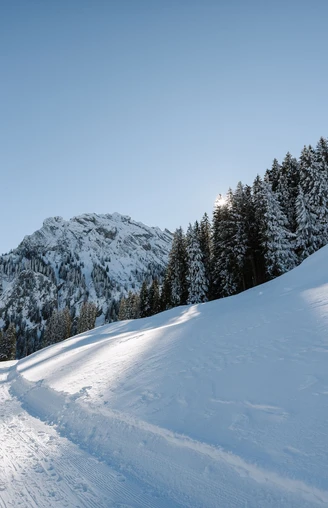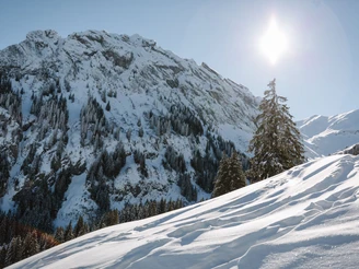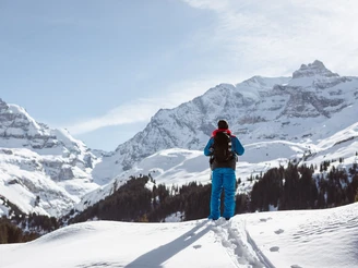 The chairlift Kiental-Ramslauenen comfortably takes you to the starting point of the snowshoe trail at the mountain station. After enjoying the magnificent view from the restaurant terrace at the mountain house, the trail first follows the toboggan run until just after the first hairpin bend. The snowshoe route then branches off to the right and descends through the Bachligrabe into the Farnital area. Over snow-covered meadows, the path leads steeply down to Lengi Weid and then towards Lengschwendi. Here you meet the Kiental Trail, which leads to Tschingelsee. A combination of the two trails is also highly recommended. With a splendid view of the village of Kiental, the path descends across open terrain. The last section to the valley station of the chairlift follows the valley hiking trail along the Chiene.