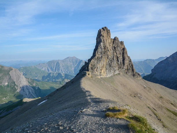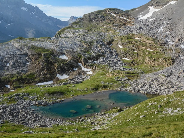 Shortly after the Engstligenalp mountain station, we follow the signs towards Kandersteg and after a few minutes enter the first ridge section, the Ärtelegrat. This leads directly to the striking rock tower of the Tschingellochtighore. We follow the ridge for almost 600 meters in altitude. Then it continues on the southeast side of the Tschingellochtighore up to the scenic Engstligengrat. A final gentle ascent takes us to P.2659, the highest point of this ridge tour. Along the wide back of the Engstligengrat, we walk for about 500 meters towards a nameless crossing where we leave the Engstligengrat. The path then turns left into the Tälli, initially steep and then leveling off into grassy terrain. After the crossing in the Tälli, where we keep left, one should be careful not to lose sight of the white-red-white trail markings, which lead slightly to the right. We then cross gently ascending below the large rock face to the next ridge section, the Schwarzgrätli. On this short ridge section, at P.2381, we come to a crossing where signposts indicate the Sunnbüel railway station (with identical time indication). This can be reached by two options: the first leads downhill to the Schwarenbach mountain hotel and then on a road across the Spittelmatte plateau to Sunnbüel. The second option leads towards the Üschinengrat via a scenic high-altitude hike to Sunnbüel.