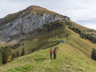 Von der Brunnihütte steigen wir der Beschilderung folgend in Richtung Greberegg ab und wandern über einen schönen Gratabschnitt mit Aussicht auf den Thunersee. Bei der Wegkreuzung Greberegg geht es links Richtung Suld, nach 200 m ist die Alphütte Greberegg erreicht. Von hier sieht man zur Brunnihütte mit dem darüber aufragenden Morgenberghorn, über dem Talschluss thront die Schwalmere und rechts davon die First und der Dreispitz. Wir steigen nach links ab und erreichen über einen steilen und schönen Waldweg das Gasthaus Suld.