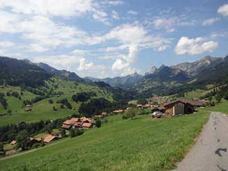 Am Agensteinhaus (Talmuseum) vorbei hinauf in den Ortskern von Erlenbach mit seiner wertvollen Bausubstanz aus dem 18. Jh. und der vollständig ausgemalten mittelalterlichen Kirche. Wertvolle Bauten befinden sich aber auch im Aufstieg über Tal nach Moos/Oberberg. Ohne nennenswerte Höhendifferenz erreicht man die Weiler Eschlen, Balzenberg und Nidflue (nach Därstetten 25 min), wo weitere sehenswerte Häuser bezeugen, wie perfekt die Zimmerleute vergangener Jahrhunderte ihr Handwerk beherrscht haben. Herrliche Aussicht talein- und -auswärts geniesst man vom Weissenburgberg (nach Weissenburg 20 min), bevor man am Standort des ehemaligen Weissenburg-Bades vorüber den tiefen Graben des Buuschebachs quert. Die auf sonniger Terrasse gelegenen Weiler Buusche, Büel und Wyssebach weisen weitere beachtliche Bauten auf. Westlich von Oberwil lädt der Gasthof Hirschen, eine ehemalige Säumerherberge, zur wohlverdienten Rast. Über Zälg und Wüestenbach trifft man bei Eichstalden (nach Boltigen 30 min) auf eines der schönsten bemalten Häuser des Simmentals. Hier beschreibt der Hausweg nochmals eine Schlaufe über das 100 m höher gelegene Adlemsried und über Tubetal nach Boltigen.