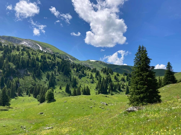 Due to the nearby parking lot and alpine farm, dozens of people gather daily in summer on its shore in good weather. The special acoustic conditions in this natural arena attract alphorn players, and many visitors shout until they find the best spot for the echo. Those who have had enough to see and hear continue hiking along the mountain slope. The Seehore with its bright, jagged limestone cliffs and karst fields now draws all eyes. Below the hiking trail, alpine meadows spread out, variably intersected by small valleys, hollows, and ridges. In places, the karst ground is covered by only a thin layer of vegetation. At Stiereberg, the trail branches off towards Zweisimmen. Before the nearly thousand-meter descent into the valley, there is still an opportunity to pause on the terrace of the nearby mountain inn, enjoy the view, and delay the descent a bit with local delicacies. Across alpine meadows and through mountain forest along the Mariedbach, the trail leads down into the Simmental and along the Simme to Zweisimmen station.