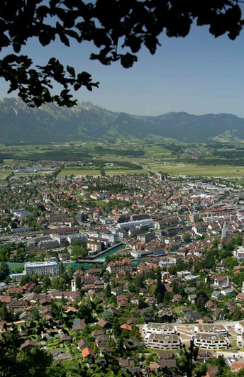Until its merger with Thun, Goldiwil was an independent municipality. On the signpost at the start location of the route at the Goldiwil Dorf bus stop, both the intermediate destination Rabeflue and the final destination Thun train station are indicated. Initially, follow the main road downwards towards Thun for about 100 meters. Now bear slightly right into Schwendibachstrasse. At the forest entrance, turn left onto a path and descend through the forest past the Geissental farmstead. Then go right, passing a second farmstead, briefly along meadows and then through forest to the blockhouse with a rest area. Here turn sharply right, then half-left and finally straight ahead, reaching Rabeflue within a few minutes. This description shows that Rabeflue is accessed by a dense network of hiking trails. Benches invite you to rest and enjoy the view. Still in the forest, the hike leads back briefly on the outbound path where you turn right towards Wartbode. The path now zigzags downward. At the next fork, continue towards Wartbode. On a forest path without many curves, you reach Wartbode with the eponymous bus stop. After crossing the main road, the route continues downhill on a path to the Jakobshübeli pavilion. Once again, an opportunity to enjoy the view of Lake Thun, the Stockhorn chain and of castle and town Thun. The castle was founded by the Zähringens and passed to the Kyburgs after their extinction. A last downward section leads to Brahmsquai on the Aare. On level ground, you reach the destination of the hike at Thun train station.