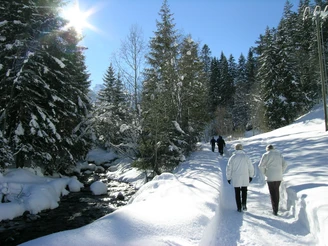 On a wide, well-prepared path, it follows the young Engstlige. The stream is partially covered with ice and snow in midwinter, while in other places it bubbles happily open. The path is mostly flat; occasionally some slight ascents must be overcome. Bir Mühli, in the Boden area, the road is underpassed (junction option to Boden–Fuhren–Adelboden, 1h30). Over Bir Brücke, the riverside path continues on the western side of the Engstlige. Only in the Roufmatta area is the stream crossed on a pretty wooden bridge. The path runs for almost 200 m on a lightly trafficked small road and then leads directly into the forest, where it rises slightly a bit away from the stream. Finally, it goes along the cross-country ski trail uphill to Unter dem Birg.