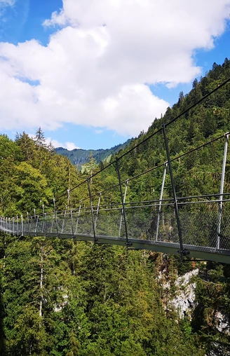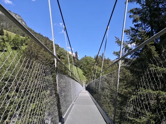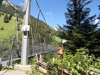 Wir stossen unvermittelt auf die 2014 und 2015 restaurierten Ruinen des Hinteren Bades und kommen aus dem Staunen über den Wagemut der Unternehmer nicht heraus, die hier vor 150 Jahren ein Badehotel betrieben haben. Auf einer kleinen Hängebrücke überqueren wir den Morgetebach. Über mehrere Treppen und einen gesicherten Weg gelangen wir zur Hängebrücke Leiternweide. Die imposante Seilbrücke hat eine stattliche Spannweite von 111 Meter und überquert die Schlucht mit dem 111 Meter tiefer liegenden Morgetebach.