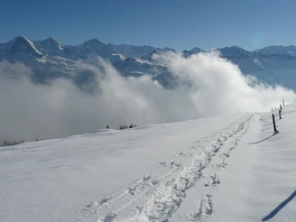 Bald ist die Alp Chüematte erreicht. Bei schönem Wetter ist an Wochenenden das Chüematte-Beizli offen. Der Abstieg nach Beatenberg/Waldegg erfolgt nun ohne Schneeschuhe über den offiziellen Winterwanderweg. Links und rechts des gespurten Winterwanderwegs finden sich jedoch zahlreiche Möglichkeiten weitere Spuren im Tiefschnee zu hinterlassen.