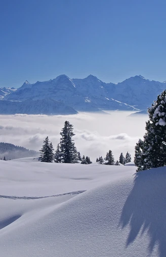 Von der Mittelstation Vorsass steigt man nordostwärts über einen verschneiten Waldweg hinauf Richtung Flösch. Nach einer kurzen Waldpartie folgt offenes Gelände welches einen wunderbaren Blick über den Thunersee frei gibt. Ab Flösch folgt der signalisierte Schneeschuhtrail in etwa dem verschneiten Sommerwanderweg durch unberührten, lichten Wald bis hinüber zur Alp Unterburgfeld. Die Alphütte vor prächtiger Kulisse mit Eiger, Mönch und Jungfrau, lädt zu einer Verschnaufpause ein.