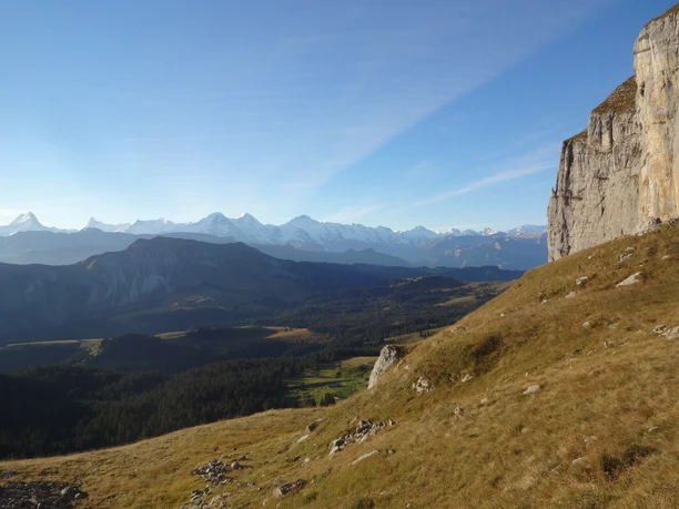 Herrlicher Ausblick über das Quellgebiet der Emme zu den Hochalpen. Durch lockeren Bergwald und karge Alpweiden führt der Pfad in ein grosses Schotterfeld, das im Kessel zwischen Steinige Matte und dem Hauptgipfel des Hohgant liegt (Pkt. 1897). Der Aufstieg zum Furggengütsch dauert aber nochmals rund eine Stunde. Die Anstrengung wird mit einer grossartigen Panoramasicht belohnt, welche vom Säntis bis zu den Waadtländer Alpen reicht. Gewaltig ist aber auch der Ausblick nordwärts über das Emmental zu den Hügeln des Mittellandes und zum Jura.