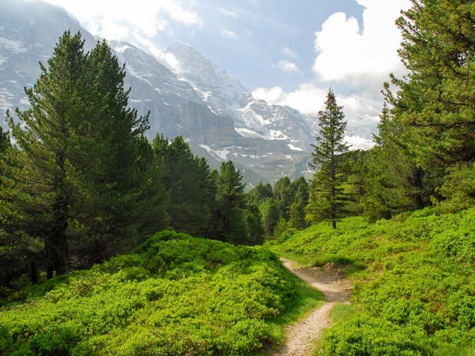 Von der Bergstation Männlichen lohnt sich ein Abstecher auf den Männlichen-Gipfel. Dieser Eckpunkt zwischen den Tälern von Grindelwald und Lauterbrunnen bietet eine prächtige Sicht über die ganze Region und weit darüber hinaus. Wieder zurück bei der Gondelbahnstation verlaufen etwa 300 Meter des Weges auf dem bekannten Höhenweg Richtung Kleine Scheidegg, ehe unser Weg nach unten in Richtung Bustiglen abbiegt. In Wegnähe bezaubern blumenreichen Bergmatten, in der Ferne berühmte Gipfel wie das Wetterhorn, Schreck- und Lauteraarhorn und natürlich das Dreigestirn Eiger, Mönch und Jungfrau. In der Gegend der «Schwarzi Flue» säumen Alpenrosen den Wanderweg und auf einer Anhöhe steht eine Reihe von prachtvollen, knorrigen Arven. Der Wanderweg führt weiter durch Arven- und Fichtenwald zur Alp Bustiglen, wo Kühe muhen und Schweine zufrieden grunzen und neugierig durch den Zaun schauen. Unterhalb von Bustiglen heisst ein Tälchen «Arvengarten». Tatsächlich gibt es hier wohl einen der schönsten und grössten Arvenbestände des Berner Oberlandes, denn die Arve gedeiht hier, wie überhaupt in den ganzen Nordalpen, eher selten. Unser Weg biegt jedoch schon von der Alp Bustiglen ab in Richtung «Unterer Brand» (Unterbrand auf der Karte). Bald taucht der Weg in den Itramenwald ein, einen wunderschönen Arven-Fichtenwald, der mit Mooren und Weihern durchsetzt ist. Lichte Bereiche geben auch immer wieder den Blick frei auf die gewaltige Eigernordwand. Von Unterer Brand schlägt man die Richtung Itramen/Aspen ein und trifft später auf Wegweiser, die zur Haltestelle Brandegg mit dem gleichnamigen Restaurant leiten. Auf der sonnenwarmen Terrasse lässt sich wortwörtlich blendend verweilen, vielleicht mit dem Genuss der legendären Apfelküchlein, der Spezialität des Hauses.