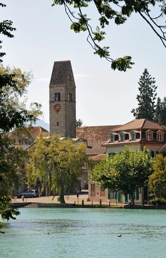 Danach überquerst du die Brücke beim Englischen Garten Richtung Talstation Harder Kulm. Hier erwartet dich eine malerische Promenade an der Aare. Die Promenade führt dich dem Fluss entlang bis in die malerische Altstadt von Unterseen. Über die von kleinen Läden und kreativen Restaurants gesäumte Marktgasse erreichst du wieder das Zentrum von Interlaken und deinen Ausgangspunkt.