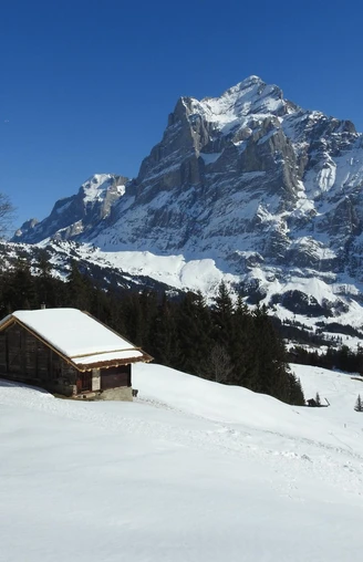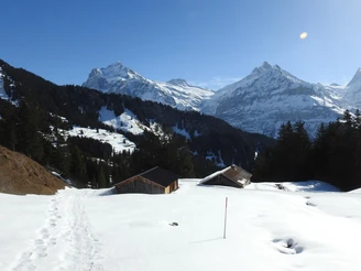 Aussichtsreiche Schneeschuhtour am Sonnenhang über Grindelwald. Vom Busparkplatz, im Zentrum von Grindelwald, gelangt man mit dem Grindelwald Bus auf die Bussalp.