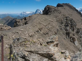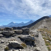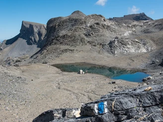 Noch ca. 15 Minuten und 100 Höhenmeter bleibt man auf dem Weg in Richtung Sefinafurgga. Auf einem teilweise unscheinbaren Pfad steigt man durch steiles Grasgelände aufwärts zum Telli, wobei der Blick auf die Blüemlisalp immer schöner wird. Der Weg bleibt steil bis man den Telli Pass zu Gesicht bekommt. Das Gelände wird flacher, ein schöner Platz für eine Rast auf dem Grasgelände. Der Wanderweg ändert seinen Charakter und der bisher grüne Aufstieg wird durch eine Steinlandschaft abgelöst. Auf dem Telli Pass bei P. 2708 hat man den Eindruck eine andere Welt zu betreten, einer Marslandschaft gleichend. Weiter folgt man geradeaus dem schwach erkennbaren Pfad in Richtung Schilthorn. Ohne nennenswerte Höhenunterschiede ist bald der Tellisee erreicht. Kurz vor der Wegkreuzung Rote Härd trifft man auf den Grat und kann den atemberaubenden Blick über das Sefinental hinweg zu den Berner Hochalpen geniessen.
