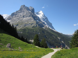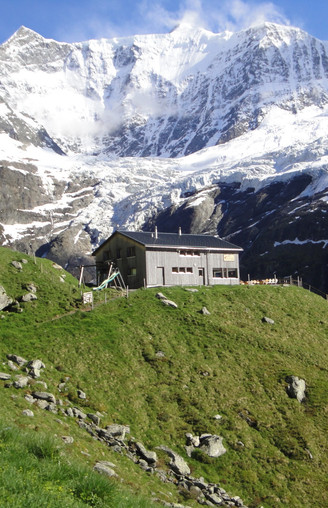 Der Weg windet sich ab der Pfingstegg gemächlich über offene Wiesen und durch den Nadelwald Richtung Gletscher. Sobald der Wald verlassen wird, beginnt der steile Aufstieg zur Hütte. Im Hintergrund sind die schneebedeckten Gipfel der Fiescherhörner zu sehen. Der Trail wird schmaler und windet sich Kurve für Kurve nach oben. Rechts unten im Tal liegen die Überreste vom Unteren Grindelwaldgletscher. Bei genauem Hinschauen sind Eisstücke und der Gletschersee sichtbar.