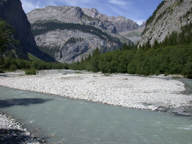 Von der Bushaltestelle Sunnbüel folgt man der Strasse, die an der Talstation der Gondelbahn vorbeiführt. Nach wenigen Minuten ist der Wanderweg ins Gasteretal erreicht. Er führt zunächst durch eine enge Schlucht, in der sich die wilde Kander ins Tal ergiesst. Hier sieht man irgendwann im Juni bereits einzelne Exemplare der seltenen Orchideenart Gelber Frauenschuh am Wegrand blühen. Wann genau dies der Fall ist, ist von Jahr zu Jahr unterschiedlich. Ausschau sollte man jedoch auch nach oben halten, und dies schon ab der ersten Wanderminute: Vor und in der Schlucht ist oft ein Bartgeier zu sehen. Deshalb gehört der Feldstecher mit in den Wanderrucksack.