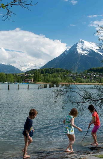 Sanft absteigend geht’s am etwas versteckten Strättligturm vorbei, wo einst die Edlen von Strättligen hausten. Jenseits der Simmentalstrasse steht man unvermittelt vor dem dunklen Schlund des Kanderdurchstichs. 1713 sollte die Kander damit zur Schuttablagerung im Thunersee gezwungen werden. Bereits ein Jahr später riss der wilde Fluss den gesprengten Stollen ein. Auf dem soliden Strättligsteg ans jenseitige Flussufer und hinauf nach Einigen. Ein Strässchen führt nun über einen aussichtsreichen Hügelrücken nach Riederen. Anschliessend wird der Rustwald auf Forstwegen und schmalen Pfaden durchschritten. Im Spiezmoos unterquert man Bahnlinie und Hauptstrasse und steigt zum bewaldeten Spiezberg hoch. Am Waldrand geniesst man nochmals einen herrlichen Ausblick über die Rebgärten zu Schloss und Schlosskirche von Spiez. Durch die Schlossanlage geht es auf einem Treppenweg hinunter zur Ländte in der Spiezbucht.
