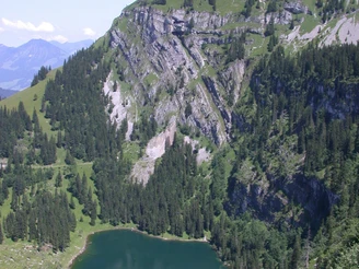 Von der Busendstation auf der Axalp geht es vorerst am Alpengasthof vorüber auf gut ausgebautem Wanderweg ostwärts. Die Steigung bleibt mässig. Rückwärts blickend ist das Augstmatthorn, der Harder und das dahinter aufragende Niederhorn zu erkennen. Die Baumreihen haben sich nach schweren Stürmen und Lawinenniedergängen merklich gelichtet. Aus den Baumstrünken haben Schüler der kantonalen Schule für Holzbildhauerei in Brienz vielfältige und originelle Skulpturen angefertigt. Kurz nach der Wegverzweigung in Färnigen quert man die sich vom Axalphorn herabziehende Bergrippe. Das in einer Senke liegende Hinterburgseeli ist erst zu sehen, wenn man fast unmittelbar an seinem Ufer steht. Wie ein Juwel leuchtet die blau-grüne Wasserfläche aus dem umstehenden Tannenkranz. Wuchtig erheben sich darüber die Felsbänder der Oltschiburg. Vom Seelein weg steigt der Weg wieder sanft an zum Übergang auf der Alp Hinterburg. Im Abstieg zu den Hütten Uf der Flue fesselt der Tiefblick ins untere Haslital, das vom Silberband der Aare durchzogen wird. Sehr steil ist der anschliessende Aufstieg auf schmalem Pfad durch die Flanke der Oltschiburg. Danach gehts in leichtem Auf und Ab zu den Hütten im Urserli (nach Tschingel– Chüemad–Axalp 2h45; nur für trittsichere, schwindelfreie Berggänger geeignet!). Unterwegs prachtvolle Aussicht zum Brienzersee. Vorsicht ist auf dem sich zusehends verengenden, steilen Felswänden entlang führenden Pfad zum Chruttmettli geboten, von wo ein breiter Waldweg nach Färnigen hinunter und zum Ausgangspunkt auf der Axalp zurück führt.