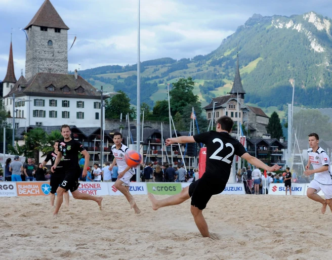 Découvrez le terrain de sports de plage polyvalent avec vue sur le lac de Thoune