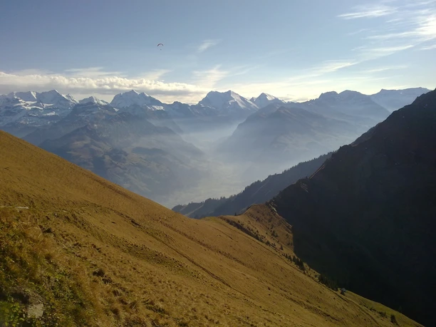 Depuis la gare de Frutigen, monter par l'Engstlige, puis longer le Leimbach. Dans le village, descendre la vieille route principale et immédiatement rejoindre les riches prairies du Niderfeld. Sur un sentier étroit et plat, arriver aux maisons de Winklen. Commence alors une randonnée de montagne de cinq heures nécessitant une bonne condition physique, car il faut non seulement franchir 1550 mètres de dénivelé, mais aussi s'adapter à différents types de sol. Suivre le Gunggbach en montant d'abord doucement dans la forêt, puis la traverser en descendant vers le ravin encaissé du Heitibach. Ce dernier est traversé bien haut. Après avoir franchi la raide pente jusqu'à la maison au Hangi, une petite pause bien méritée s'offre enfin. Au beau point de vue Eggweid, on profite déjà d'une vue panoramique remarquable. En contournant la crête pâturée, le sentier descend doucement dans le ravin Schlumpach, avant de grimper en deux courtes pentes raides sur la crête pâturée du Senggi. Passer la cabane Ogis Senggi sur l'alpe Unterniesen, continuer vers l'alpe Oberniesen et atteindre la selle entre le Niesen et le Fromberghore, le Cheesbödi. La vue sur le Simmental est splendide et on aperçoit en arrière les Hautes Alpes bernoises ! Il reste encore la traversée raide du versant jusqu'au Schafboden, avant d'arriver par le sommet sud à l'altitude panoramique du Niesen avec la maison de montagne et la station du funiculaire.