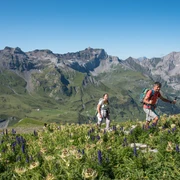 Bis P.1817 geht es auf gleichem Wege zurück, von wo wir uns auf den weiss-blau-weiss markierten Felsenpfad begeben. Die Schlüsselstelle wird bereits nach 5 min erreicht, so dass man Gelegenheit hat, sich die Stelle erst einmal „anzuschauen“, wenn man sich der Begehung unsicher ist. Über eine kurze Leiter und eine exponierte Querung mit Drahtseilsicherung wird der Felsgürtel unterhalb der Fisialp umgangen. Gute 20 min später sind wir nach der Kreuzung P.1804 wieder auf einem weiss-rot-weissen Wanderweg unterwegs. Auf diesem ist bald die oberhalb der Baumgrenze gelegene Fisialp erreicht. Über Alpwiesen steigen wir bergauf bis zur Wegkreuzung und der Schutzhütte Fisi Schafberg (P.2090). Mit kaum noch Steigung geht es das letzte Stück zur Jegertosse, anfangs durch Lawinenverbauungen und dann über Wiesengelände. Die Jegertosse ist zwar nur eine vorgelagerte Graskuppe des Innere Fisistock, doch die Aussicht auf die vergletscherte Flanke des Balmhorn und die umliegenden Täler ist schlicht überwältigend. Und das flache Wiesenplateau lädt dazu ein, die Beine für eine Weile auszustrecken bevor es in den langen Abstieg geht.