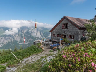 Vom Bahnhof Kandersteg folgen wir direkt der Beschilderung zur Doldenhornhütte. Nach rund 2 km treffen wir auf den Abzweig zur Doldenhornhütte. Hier steht eine Informationstafel über geologische Ereignisse im Bereich des Doldenhornmassivs. Gleich zu Beginn wird die senkrechte Felsstufe über den Bärentritt überwunden, welche bereits von Kandersteg auffällt. Den Teil unterhalb der Felswand zügig begehen – Steinschlaggefahr. Anschliessend wird der Pfad flacher und führt oberhalb der Felsstufe Richtung Westen. Bei der Wegkreuzung Biberg geht es nach links, wo man im Wald schnell an Höhe gewinnt. An einer Stelle ist ein Bach zu queren, hier ist Vorsicht und Trittsicherheit erforderlich. Die üppige Waldflora ist geprägt von Pestwurz gespickt mit den blau schimmernden Pestwurz-Blattkäfern. Von der Wegverzweigung P.1817 sind es noch gut 15 min bis zur anmutig gelegenen Doldenhornhütte.