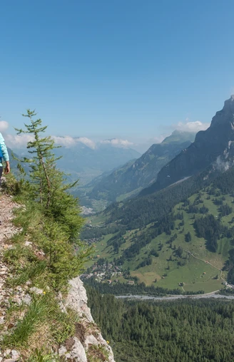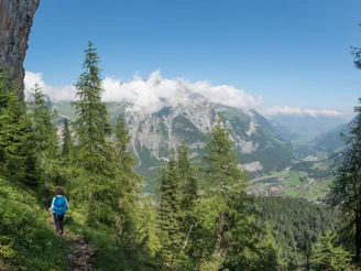 Zurück bei Fisi Schafberg begeben wir uns in den Abstieg nach Kandersteg. Dieser führt zu Beginn durch zahlreiche Alpenrosenstöcke und Bergkiefern, später durch den Wald. Anfangs noch steil und mit zwei drahtseil-gesicherten Stellen, wird der Weg flacher und trifft nach den Alphütten I de Schleife auf die Kreuzung Dürreschwand. Hier halten wir uns links und steigen nochmals fast 300 Hm ab, bis der Wald verlassen wird und man kurz darauf an der Hauptstrasse nach Kandersteg steht. Von hier ist man in gut 15 min am Ausgangspunkt Bahnhof Kandersteg zurück.
