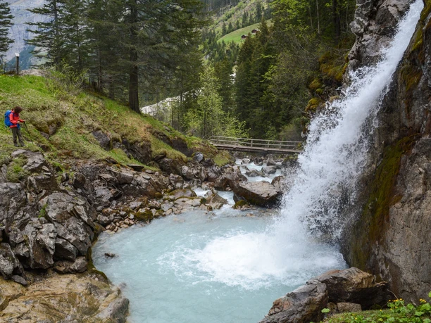 Nous montons d'abord sur la rive gauche de la Lütschine jusqu'à Sichellauenen, puis à droite de la Lütschine en suivant le sentier de montagne jusqu'à la maison d'hôtes Trachsellauenen. Dans cette région, de l'argent, du plomb et du fer ont été extraits pendant une courte période au XVIIe siècle. Les fondations de l'ancienne mine ont été restaurées en 1994 par le service archéologique et peuvent être visitées en passant. À la bifurcation du chemin vers la mine, nous suivons la signalisation vers la cabane de montagne Schiirboden, puis aux chutes de Holdri. Peu après Schiirboden, le chemin vers les cascades bifurque à droite au milieu d'un alpage. La courte excursion d'environ 200 mètres jusqu'aux chutes vaut le détour. Un banc sur une belle prairie près des chutes invite à une pause pique-nique. Autour des cascades poussent de nombreuses primevères et la vératrose blanche toxique.