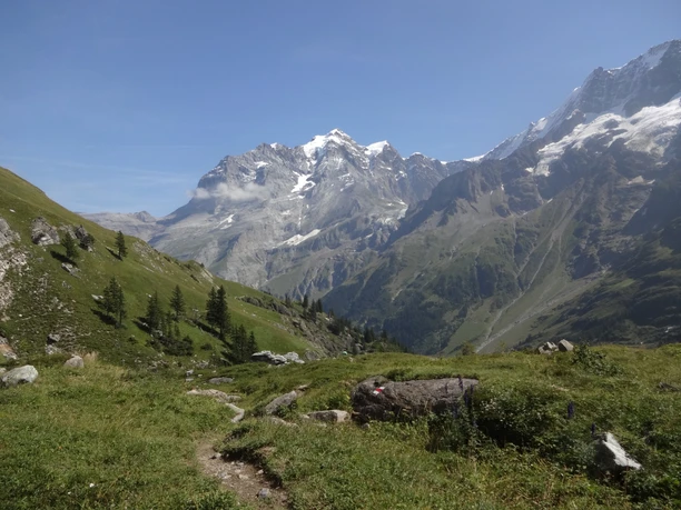 Pour le retour, nous suivons le sentier en hauteur vers le nord jusqu'à la maison d'hôtes Tschingelhorn près de Folla. Ensuite, il descend constamment tout droit à travers la forêt de Schwendi en suivant la signalisation vers Stechelberg, retour au point de départ de la boucle.