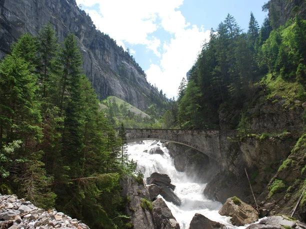 Depuis la gare de Kandersteg, suivre le remblai de la voie du côté du village. Traverser le passage inférieur jusqu'à Bütschels, puis longer la Kander jusqu'à Filfalle, où la ligne de chemin de fer est de nouveau sous-terraine. Passer devant la station inférieure du téléphérique Sunnbüel à Eggeschwand, puis monter à travers la forêt jusqu'à la Kander qui s'élance furieusement dans son lit rocheux. Le chemin bien aménagé suit les eaux sauvages à travers la « Chluse » jusqu'au restaurant Waldhaus. Ensuite, on marche aisément à travers la large vallée du Gastereholz. Superbe vue sur les cascades qui jaillissent des parois rocheuses sous le Tatelishorn et sur les ruisseaux sauvages qui descendent du glacier Balmhorn. Accompagné le plus souvent par le bruit de la Kander qui serpente à travers son large lit de gravier, le chemin plat traverse la forêt mixte d'intérêt botanique en direction de la vallée. Sous Staldi, la Kander est traversée, puis on atteint Gastere/Selden par un chemin bien aménagé en pente. De nombreux virages mènent maintenant en pente raide jusqu'à la Gfelalp, puis à travers des pâturages et des marches rocheuses jusqu'à la Balme. Magnifique vue vers l'est sur le Kanderfirn jusqu'à la Jungfrau. Ensuite, le glacier Lötsche est traversé. Des marques colorées et des poteaux indiquent la direction vers la moraine latérale, où un sentier bien distinct suit cette dernière. On suit aussi les marques colorées pour monter la langue rocheuse (prudence lors de la descente ; attachez les enfants !). La partie la plus raide est franchie, et la large cuvette du col de Lötsche offre une vue vraiment royale sur les montagnes bernoises et valaisannes. Au-dessus de surfaces rocheuses, descente vers le Stierstutz puis jusqu'à la merveilleusement située Kummenalp. Ensuite, une descente raide de 700 m sur la droite du ruisseau Färdan à travers la forêt de Färda jusqu'à Ferden dans la vallée de Lötschental.
