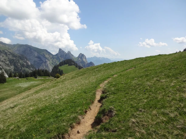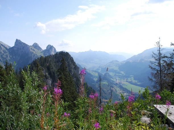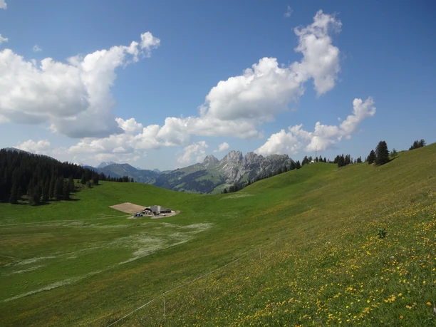 Un court chemin de gravier mène de l’arrêt de bus au Jaunpass à une petite route desservant les exploitations d’alpage de la région de Bäderberg. En larges lacets, le chemin monte en douceur, parfois en forêt, mais majoritairement sur des pâturages ouverts. Jusqu’au Grosse Bäder, il faut accepter une partie de revêtement dur. La vaste vue sur la région de Saanen, les montagnes vaudoises voisines et les formations dentelées des Gastlosen, proches au point de les toucher, offre un beau spectacle. Un arrêt court vaut le détour à l’exploitation d’alpage du Grosse Bäder. La famille d’alpagistes produit non seulement du fromage de montagne épicé et du Mutschler à base de lait de vache, mais aussi des variations inhabituelles de fromages de chèvre aux herbes ou au cumin. Après Bäderberg, le chemin continue d’abord tout droit le long de la pente, puis se rétrécit en sentier de montagne et monte légèrement jusqu’à Buufeli. Il continue ensuite avec de légères montées et descentes par Uf Pfad jusqu’à Zitbode, puis, toujours avec la formation rocheuse marquante du Bäderhorn sur la gauche, retourne vers Bäderberg. Le retour par le Grosse Bäder jusqu’au Jaunpass se fait en sens inverse sur le même itinéraire qu’au début de la randonnée.