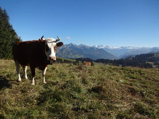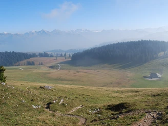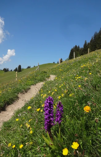 Depuis le sommet du col, la suite du chemin descendait autrefois raide par la gorge escarpée de Spitzenegg vers le Jäunli. Aujourd'hui, on reste sur le sommet offrant une belle vue. Une route alpine fait un grand détour autour du Zügweg équipé de remontées mécaniques, vers le marécageux Bädermoos, où elle se divise et tourne vers l'ouest autour de la Bäderegg. En montant toujours en douceur, la petite route tourne maintenant vers le nord dans la cuvette de tourbière du Bäderberg, au-dessus de laquelle s'élèvent les falaises du Bäderhorn. Ensuite, on se dirige directement vers la crête clairsemée boisée et atteint à la bifurcation de l'ascension du Bäderhorn (point 1744) le point culminant de la randonnée. La vue sur les montagnes de la vallée de Jaun et sur Jaun, situé 700 m plus bas, est splendide. Les bosses rondes et verdoyantes au-dessus de la vallée d'Abländschen contrastent magnifiquement avec les dents acérées de la chaîne de Gastlosen. La descente demande un peu d'attention. Le chemin descend d'abord tranquillement par le versant nord du Bäderhorn. Après avoir traversé une zone glissante, on descend très raide le long de celle-ci vers l'Ober Obfängli. Ensuite, un chemin carrossable en zigzag descend avec quelques montées jusqu'à la petite route à Leimera, où le chemin historique du col venant de Chlus (parcours 30a) rejoint. Comme un chemin panoramique, la petite route descend en nombreux virages vers Grabenweidli. Dans le virage étroit sur le chemin forestier vers la vallée, il faut rester sur place, puis descendre toujours près du Oberbach jusqu'à Kappelboden à la route du col, et sur un sentier parfois en contrebas jusqu'au centre du village de Jaun, dont la désignation française, Bellegarde, fait référence à une tour de guet.