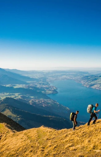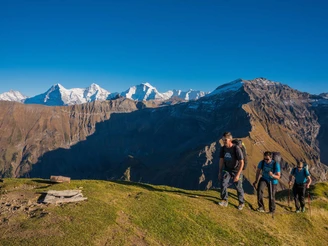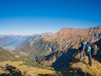 Qui dit que le Morgenberghorn doit être gravi le matin? Le point culminant de la chaîne du Leissiggrat, qui offre d’ailleurs une vue panoramique — est également idéal pour un tour d’après-midi d’automne et offre aux randonneurs un plaisir particulier sous la forme d’une expérience de sommet en soirée. Depuis le terminus du car postal à Saxeten, suivez la petite route en direction de la vallée pendant quelques minutes. Un chemin de montagne bien entretenu bifurque ensuite vers la descente et mène alternativement à travers des bois ombragés et des prairies de montagne odorantes. Au fur et à mesure que l’on prend de la hauteur, la vue s’étend de plus en plus sur l’ensemble du bassin du lac de Brienz. En passant par les cabanes de Mittelberg, vous atteignez le Rengglipass, le passage du Saxettal au Suldtal. Les sommets saisissants du Dreispitz viennent couronner la petite vallée pittoresque. Du haut du col, le sentier bifurque vers le Morgenberghorn en direction du nord. L’ascension est très raide par endroits. Après une côte de terrain exposée, des passages tout aussi exposés se succèdent sur le flanc ouest du Horn. Un câble fixé le long de la pente aide à la traversée. Néanmoins, ces passages clés exigent un pied sûr et pas de problèmes de vertige. Après une dernière montée sur un agréable chemin herbeux, on aperçoit l’étendard avec les armoiries suisses et bernoises au sommet – et vous serez immédiatement captivé par la vue panoramique époustouflante. Au nord, la vue s’étend sur les lacs de Thoune et de Brienz, sur le Niederhorn, le Hohgant et la chaîne de l’Augstmatthorn et du Brienzer Rothorn, tandis qu’au sud, les massifs rocheux de la Schwalmere et derrière eux la chaîne des Hautes-Alpes bernoises sont tout simplement fascinantes. Le retour dans la vallée suit le même itinéraire.