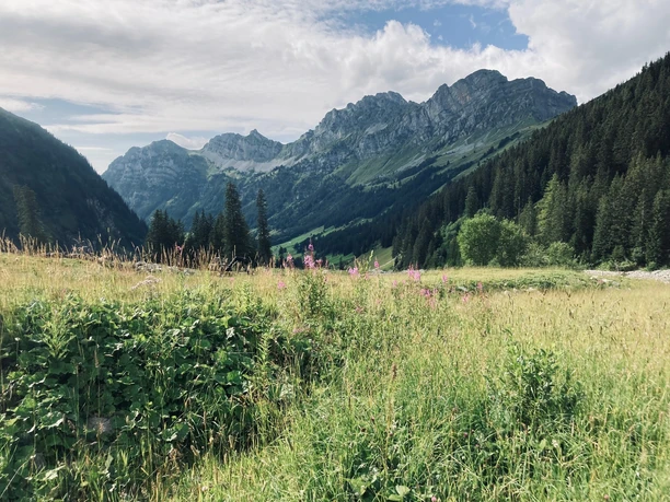 De la gare de Matten au centre du village, en suivant le ruisseau Färmelbach en direction de la vallée. À l'épingle à cheveux, continuer dans la même direction et monter sur l'ancienne route étroite en terre. En raison de la pente relativement forte (jusqu'à 34 %, ce qui était clairement trop pour les chasse-neige !), un nouvel accès à la vallée de Färmeltal a été construit en 1972, permettant l'accès même en hiver. Aujourd'hui, l'ancienne route, qui traverse la vallée boisée semblable à une gorge vers Färmel/Stalde, est principalement fréquentée par des randonneurs. La vallée s'élargit ici. Des groupes d'érables enrichissent le paysage du hameau allongé de Färmel. Au-dessus de la ceinture de forêts d'épicéas traversée par des couloirs d'avalanches, s'élèvent les parois et arêtes abruptes de la Spillgerte et du Rothore, tandis que le Rauflihore paraît plus doux. À Blachti et Büel, certaines maisons portent des murs de protection contre les avalanches ou des coins de fente en pierres : témoins des hivers rudes. Le chemin contourne le fond de la vallée au pied de l'Albristhubel, un excellent point de vue. Près des chalets de Färmberg, le chemin bien aménagé rejoint le sentier alpin accidenté qui monte à travers une forêt peu dense jusqu'à l'alpage Grod. Splendide vue sur la fin orientale de la vallée avec les Türmlihore, Gsür et Albristhore. Un peu plus haut, le sentier chaotique traverse le lit torrentiel désert et suit la gorge du ruisseau, puis la pente d'éboulis du Gsür et enfin monte raide vers la brèche du col Furggeli en direction sud. Soudain, au-dessus de la verte vallée d'Entschlige, se dévoile la couronne de névés allant du Wetterhorn au Wildstrubel. Le regard en arrière porte sur le massif de la Spillgerte jusqu'aux sommets préalpins des Gastlosen au Stockhorn. La descente est raide sur des traces de sentier peu marquées, par des pentes de pierres et de prairies jusqu'à la terrasse d'alpage du Furggi. Parmi les différentes variantes de descente, les randonneurs sûrs de leur pas choisissent en terrain sec le chemin à gauche, qui traverse la pente herbeuse abrupte de Heeli, promettant une randonnée panoramique au-dessus de la vallée de l'Allebach. Le chemin de droite est plus sûr mais moins entretenu. Au restaurant Schärmtanna, les deux chemins se rejoignent. Ensuite, on descend jusqu'à l'Allebach et le suit sur la rive opposée jusqu'au pont Steinige Brügg, qui relie au centre du village d'Adelboden.
