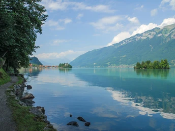 Le parcours continue le long du rivage, avec régulièrement de belles vues sur le lac. Bientôt, on découvre l'île de l'Escargot, juste avant Iseltwald, et quelques minutes plus tard, on se tient sur la péninsule et au cœur du seul village sur la rive gauche du lac de Brienz.