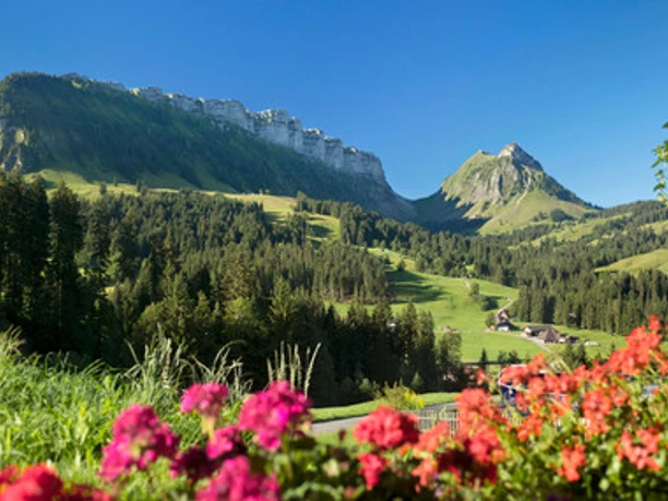 Depuis l'arrêt de bus de Schwarzenegg, on marche jusqu'au cimetière, puis on continue à travers une vaste plaine d'altitude. On longe d'abord la lisière de la forêt, puis on monte raide par un sentier forestier accidenté jusqu'à la ferme Chürzi. Au milieu du 19e siècle, ce chemin était la seule liaison entre Schwarzenegg et l'Eriz. La ferme Hintere Kapfern est particulièrement belle ici, avec une vue sur les falaises de Hohgant, Solflue et Sigriswilgrat. En regardant en arrière, on découvre un panorama sur les sommets et l'arête de Gurnigel, Längenberg et Guggershörnli. En suivant toujours la crête, on atteint la cabane Chnubel dont la vue est impressionnante. En passant par Honegg, le chemin descend ensuite assez raide au-dessus de Honeggli à travers la plaine de tourbières de Rotmoos jusqu'à Innereriz.