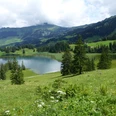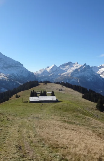 Avec le téléphérique de Wispile jusqu'à la station de montagne Höji Wispile. C'est ici que se trouve le point de départ du sentier informatif Meteo. Le chemin de crête qui suit mérite pleinement ce nom. On monte brièvement à travers l'alpage jusqu'au point le plus haut de la randonnée, la crête : la vue impressionnante s'étend du Wildhorn aux montagnes de la région du col de Sanetsch jusqu'à l'Oldenhorn, et le panorama sur le Saanenland est incomparable. On suit la crête vers le sud, en direction de la large pyramide rocheuse du Spitzhorn. À la première cabane de Höhi Wispile, différentes variantes de descente s'offrent (jusqu'à la station intermédiaire Underi Bodme 1h ; à Feutersoey 1h30, chemin de montagne ; à Lauenen 1h10). Au Wispiletritt (vers Gschwändvorschess–Feutersoey 1h, chemin de montagne), la promenade paisible sur l'alpage vert prend brusquement fin : la pente boisée descend abruptement vers la Chrine (vers Lauenen 1h ; au lac de Lauenen 1h15). La descente est cependant facile sur un chemin très bien aménagé. On descend ensuite dans la vallée par un chemin carrossable à travers le Ussere Saaligraben. Plus bas, le chemin devient une route asphaltée. On bifurque donc rapidement vers un sentier pédestre. Celui-ci suit la lisière du bois le long de l'Innere Saaligraben et évite autant que possible la route sinueuse qui descend vers le fond de la vallée. En traversant le fond herbeux, on atteint Gsteig. Une visite de l'hôtel Bären, une maison richement décorée de Saanen datant de 1756, ainsi que de l'église consacrée en 1453 avec ses incrustations en bois, sa chaire richement décorée et ses murs intérieurs ornés de citations bibliques, est vivement recommandée.