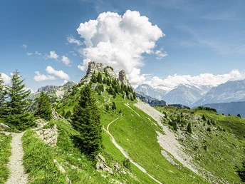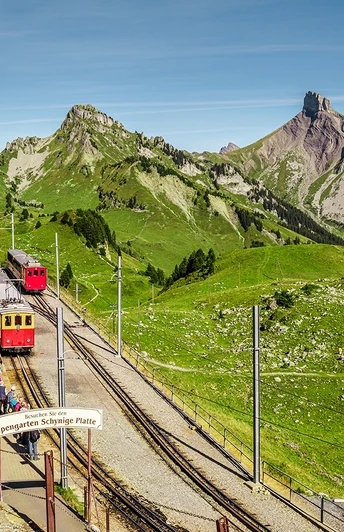 Le chemin panoramique de la Schynige Platte en direction du point de vue de Daube débute à l’hôtel de montagne au-dessus de la gare d’arrivée. Vous pourrez y admirer une vue splendide sur les lacs de Brienz et de Thoune et sur les Alpes bernoises et son célèbre trio de sommets, l’Eiger, Mönch et la Jungfrau. Vous continuez ensuite sur une arête sécurisée jusqu’au pied de l’Oberberghorn, dans un paysage de rhododendrons de montagne et de calcaire. Des échelles à pic permettent de monter au sommet de l'aiguille. Le chemin part ensuite en direction du Loucherhorn, que l’on contourne vers le Sud, où la vue sur les hauts sommets alpins est de nouveau superbe. On traverse une ouverture naturelle dans un affleurement rocheux, le Güwtürli, pour bifurquer dans le paysage rocheux du Güw. Des petits épicéas rouges qui luttent pour survivre constituent la seule touche de couleur du paysage karstique. Sur l’Egg, on passe sur le flanc de la paroi de Sägissa. La montée au Sattel Männdlenen passe par une vallée rocheuse. La randonnée continue ensuite en direction de Fulegg, Avant de se poursuivre en dessous du Faulhorn où un détour par l’hôtel de montagne est possible. Commence ensuite la descente vers le lac de Bachalp. Depuis ses eaux sombres, la vue sur le Wetterhorn, le Schreckhorn et le Finsteraarhorn est incomparable et va même jusqu’au First avec le glacier de Grindelwald et l’Eiger.