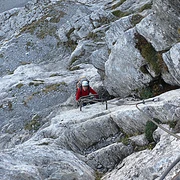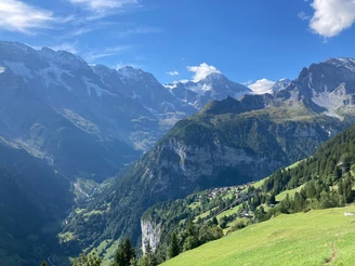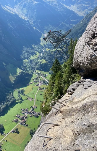 À travers un tunnel non éclairé (et non signalé) jusqu'au côté sud des courts de tennis (tableau d'information), puis le long du mur est des courts de tennis. À partir de là, descente et traversées sur le terrain en terrasses de la Mürrenfluh, où se succèdent des sections rocheuses et des sections terreuses. L'exposition augmente, et bientôt le premier passage clé est atteint : le passage environ 600 mètres au-dessus de la vallée de Lauterbrunnen, avec la station de téléphérique et le parking – ici, il n'y a que les échelons en fer et beaucoup d'air sous les pieds. Puis le parcours continue, alternant calcaire et forêt le long de la Mürrenfluh. Une courte échelle verticale offre de la variété, de même qu'un pont à trois câbles plutôt instable au-dessus du Mürrenbach. C'est aussi là que se trouve la tyrolienne de 60 mètres, qui ne peut être utilisée qu'accompagné d'un guide de montagne (panneau "fermé", il faut donc choisir la branche droite à la bifurcation). Avant et après le Sinterbach, plusieurs passages avec échelles, dont certaines sont verticales ; toutefois, l'exposition est faible. Un court pont à trois câbles traverse un ravin, offrant une nouvelle variété. À environ 1300 mètres, on atteint le point le plus bas du via ferrata. Et bientôt arrive la finale : le pont suspendu de 80 mètres, très instable, sans câble continu auquel on pourrait vraiment s'accrocher. Le câble de sécurité, auquel on se connecte, est mobile et fixé uniquement à chaque quatrième point d'ancrage ; au moins, on peut s'appuyer au milieu du pont sur le câble porteur… Le pont suspendu peut toutefois être évité en sortant vers la route entre Mürren et Gimmelwald. Après ce pont, le via ferrata de Mürren se termine, il ne reste plus qu'à monter brièvement jusqu'au tableau d'information avec le livre de route et à la station du téléphérique de Gimmelwald (1363 m, 3 heures).